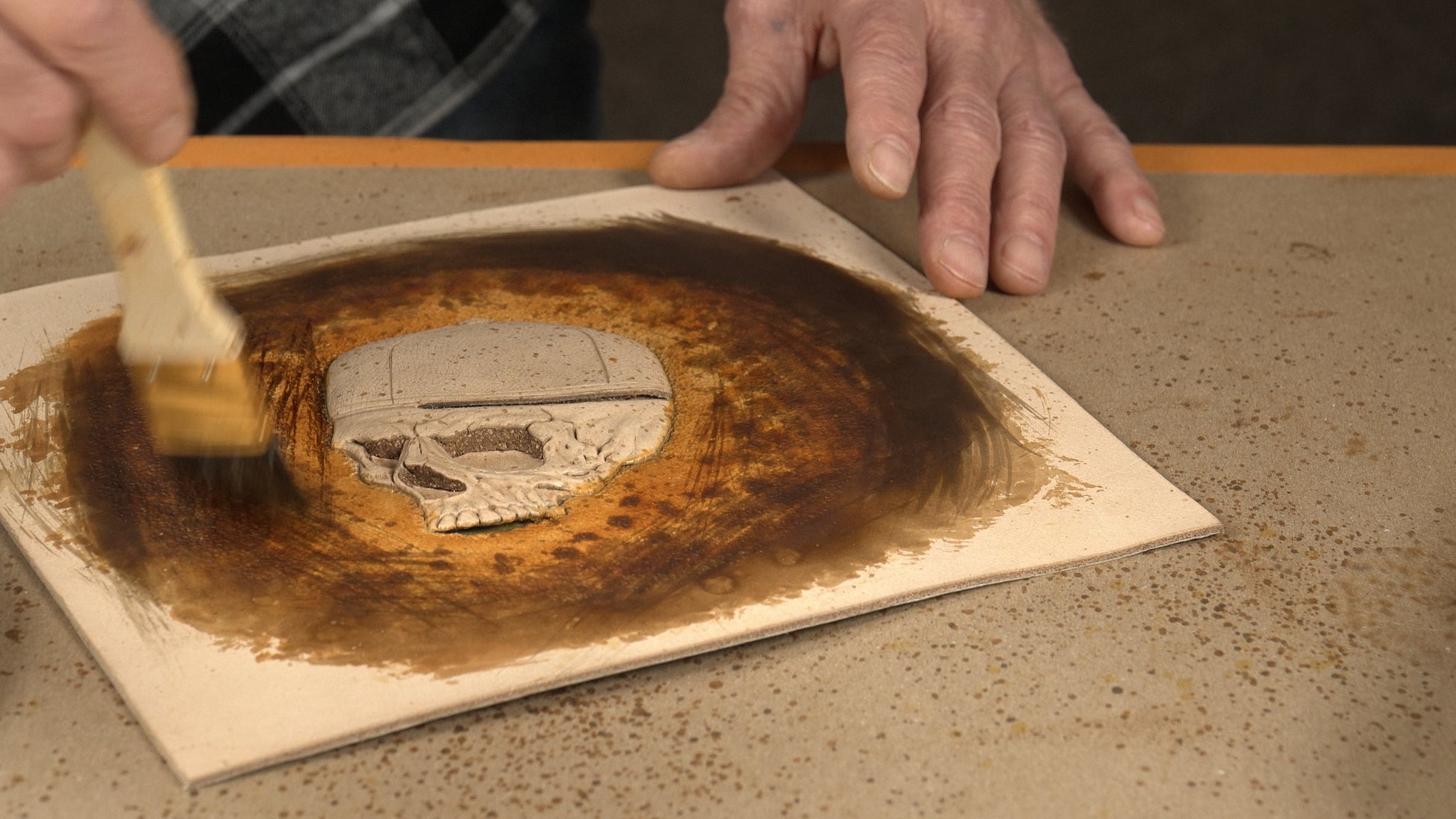 In this in-depth course, master leather artist Jurgen Volbach teaches you how to combine embossing, modeling, and intricate color techniques to create a striking skull-and-baseball-cap leather artwork. You’ll not only learn to raise and shape the leather for stunning dimension but also design and construct a custom frame to finish your piece like a true showpiece.