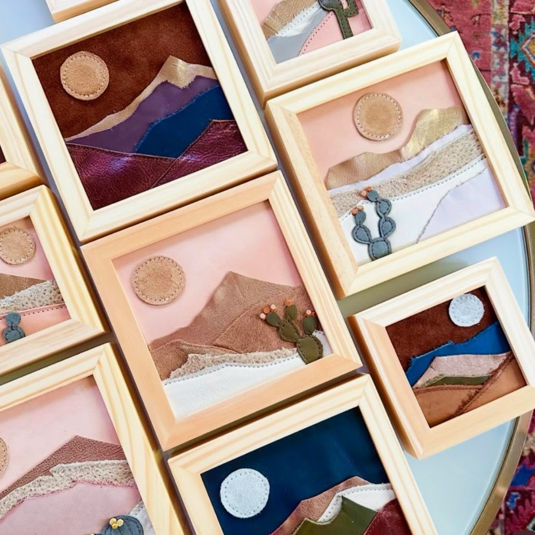 - Shadowboxes or framed leather illustrations
